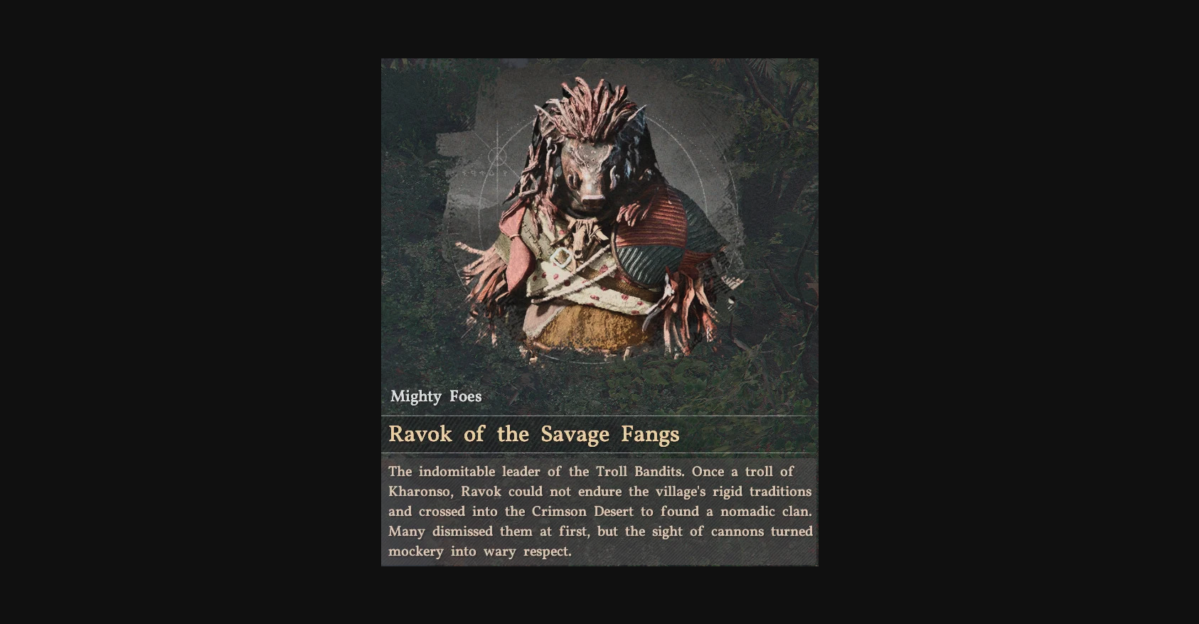 Defeat Ravok of the Savage Fangs at Bordig Camp β a two-phase hand cannon fight with dangerous boar-riding bandit adds. Loot the Rock Tusk Warthog Molar and craft the Sigil of Solidarity.