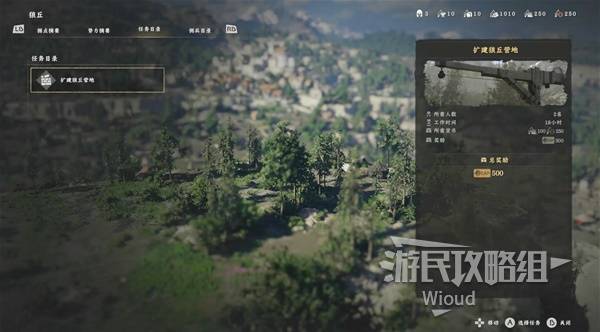 In the task menu, select "Expand Howling Hill Camp." Assign mercenaries Luc and Ronald to the task. Camp expansion runs on a progress timer β start it and go do other things while it completes.