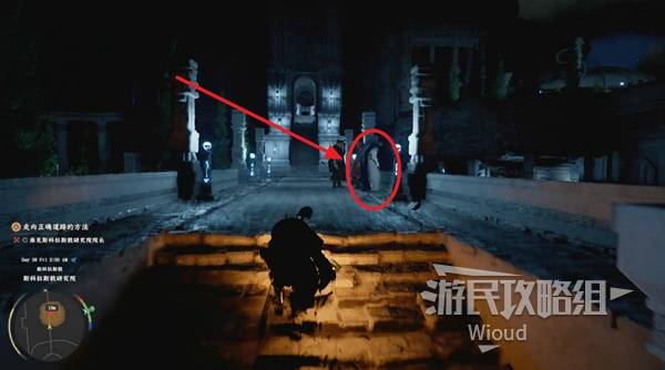 Travel to the map marker on the left, equip the researcher outfit, enter the institute, and talk to the Dean on the bridge. Follow him to the next location.