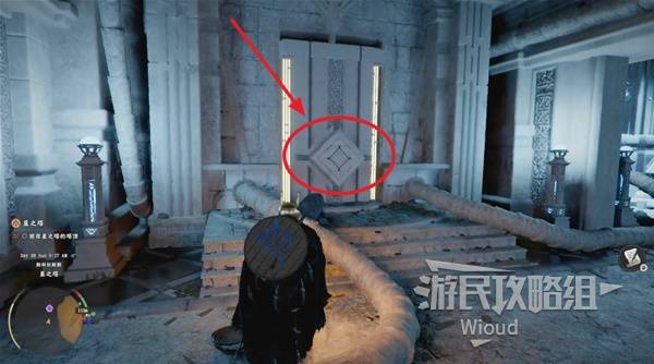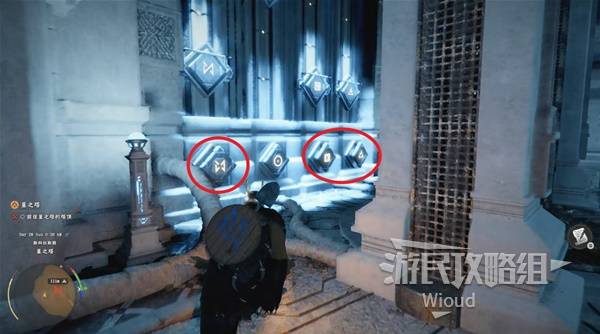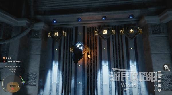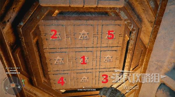At the lower level marker, interact with the door. Click the blocks in the order shown below to solve the seal: