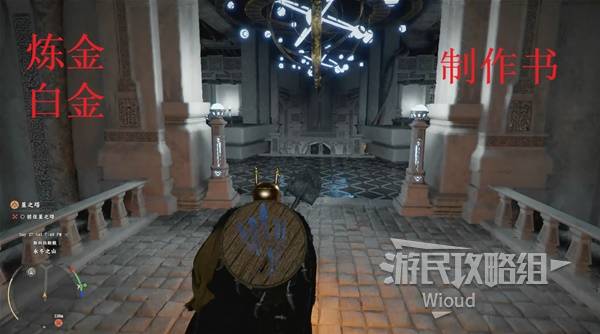 Climb to the second floor: left bookshelf has the alchemy recipe "Platinum," right bookshelf has "World Ranged Weapon β Gun Collection Vol. 3."