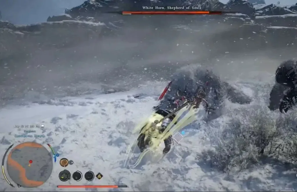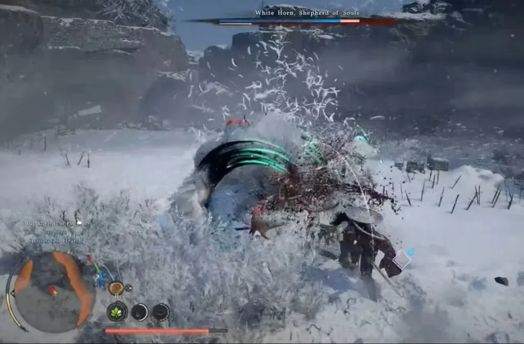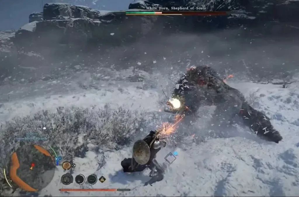 White Horn throws boulders β dodge sideways, never charge forward. When the stun meter fills from fire damage, you can mount White Horn and attack his weak point for heavy damage. Stay mobile and strafe constantly.