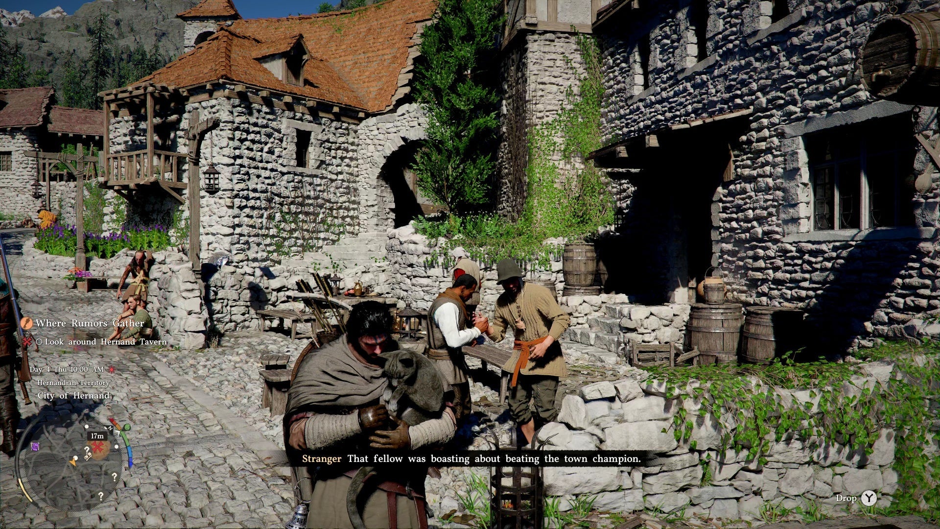 Head to Hernand Tavern β it's marked with a large red X on your map, or just follow the main road. Look for the keg sign and outdoor tables.