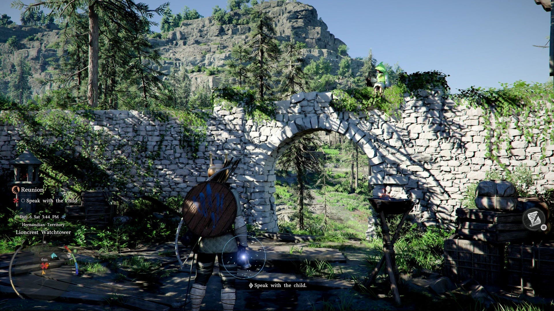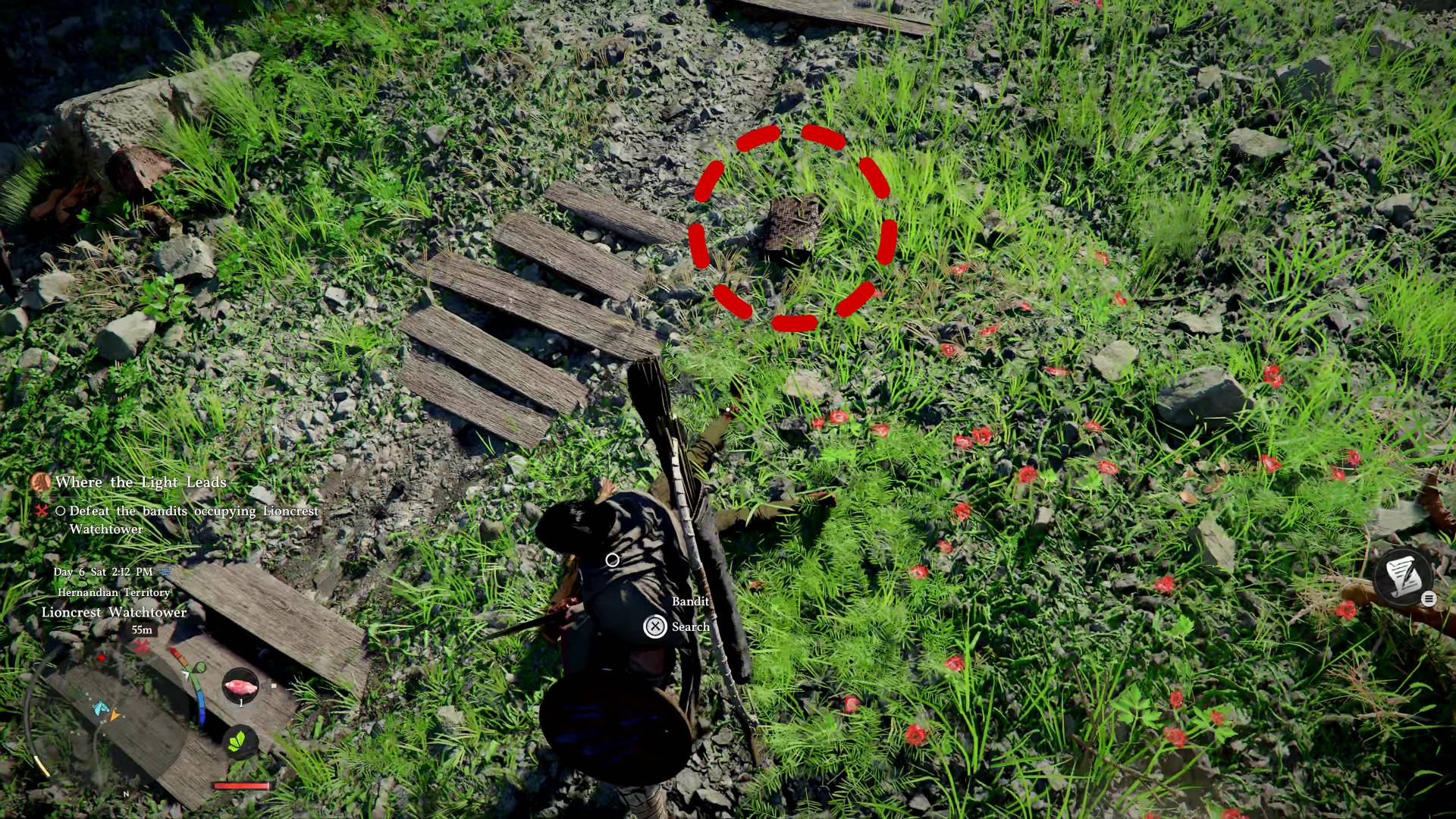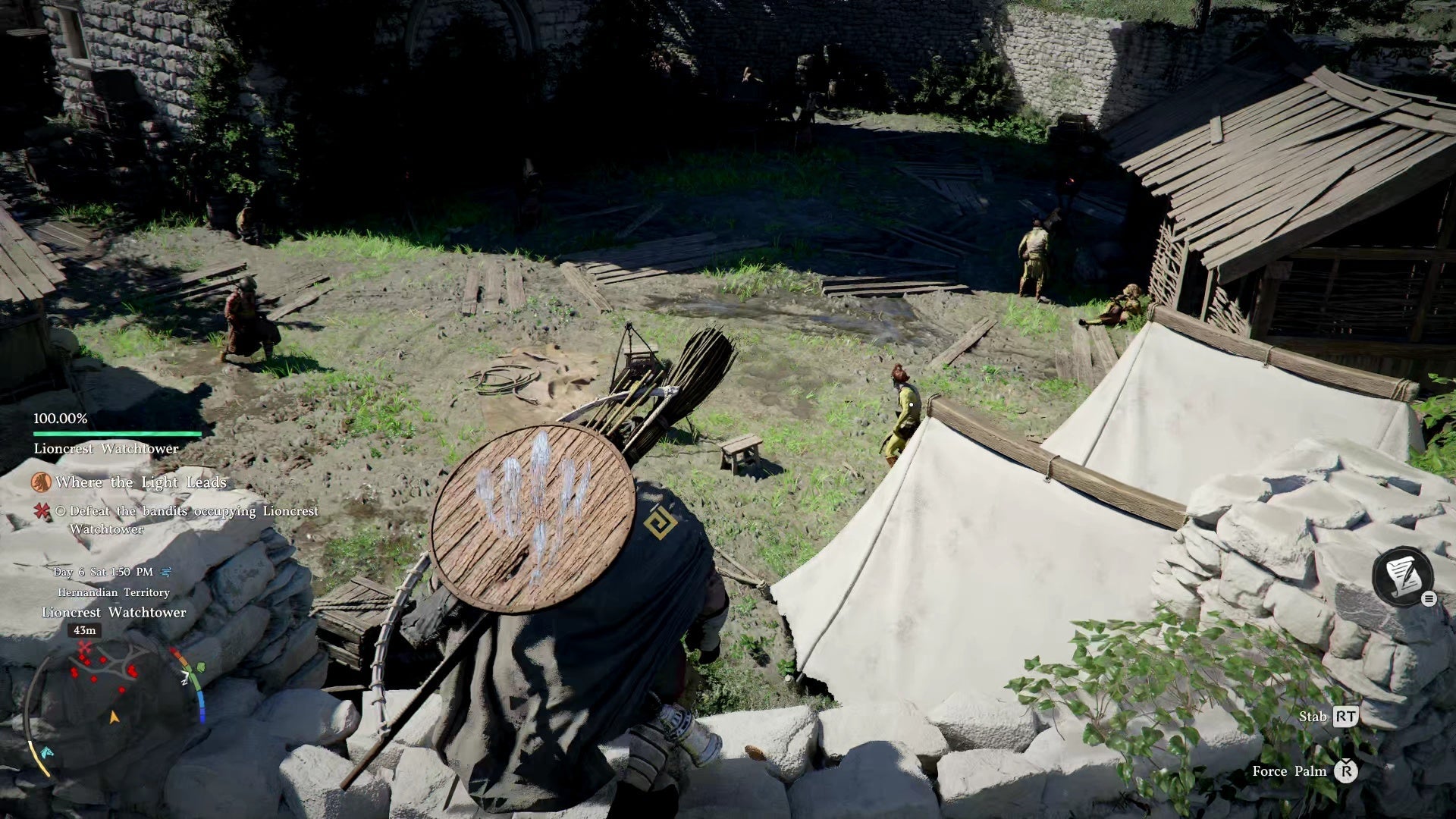 The watchtower is west of Hernand, occupied by bandits. Prepare by stocking healing items from the Hernand Inn or hunting deer in the nearby woods.