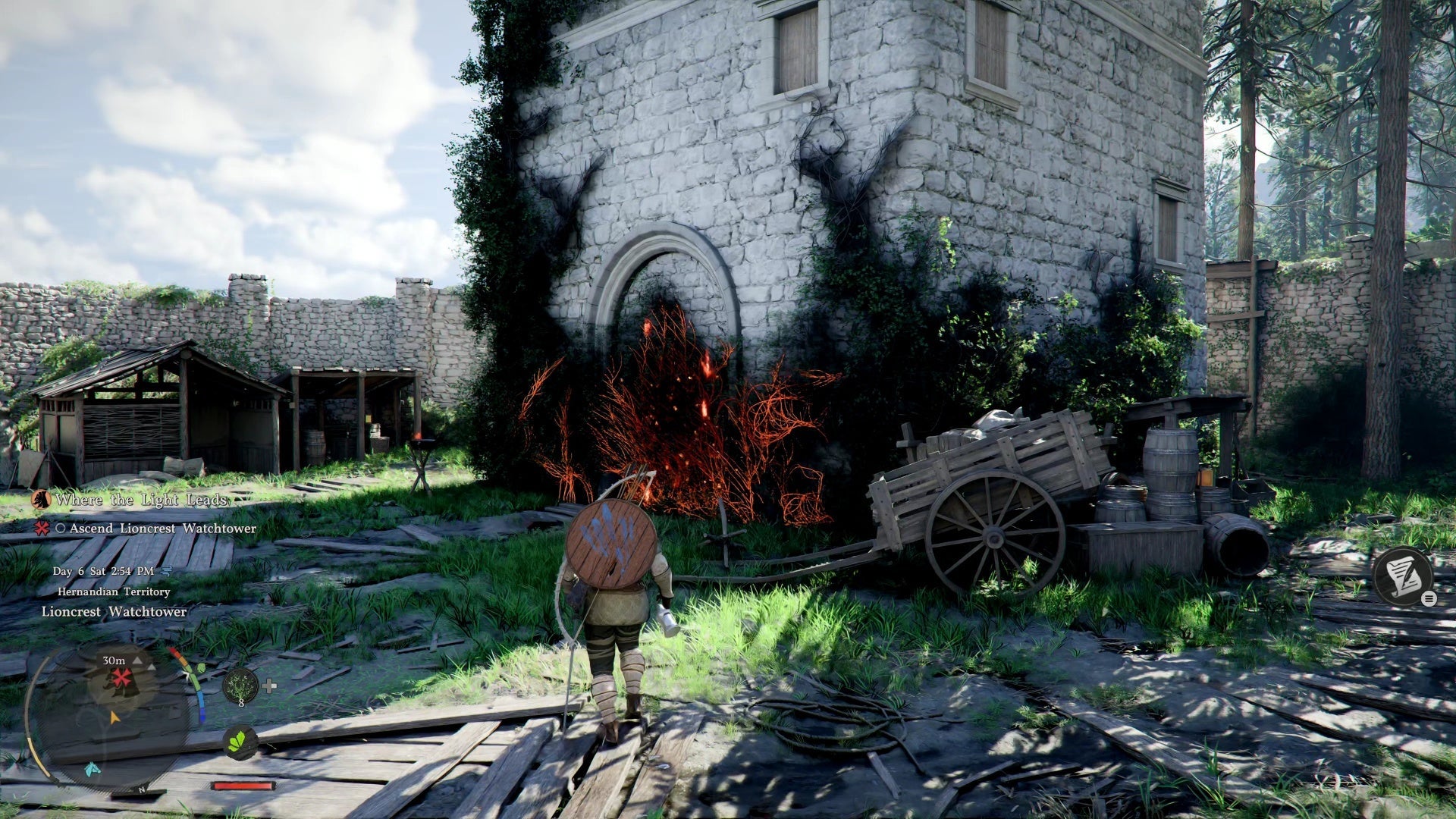 To enter the tower, burn away the vines blocking the entrance. Options: