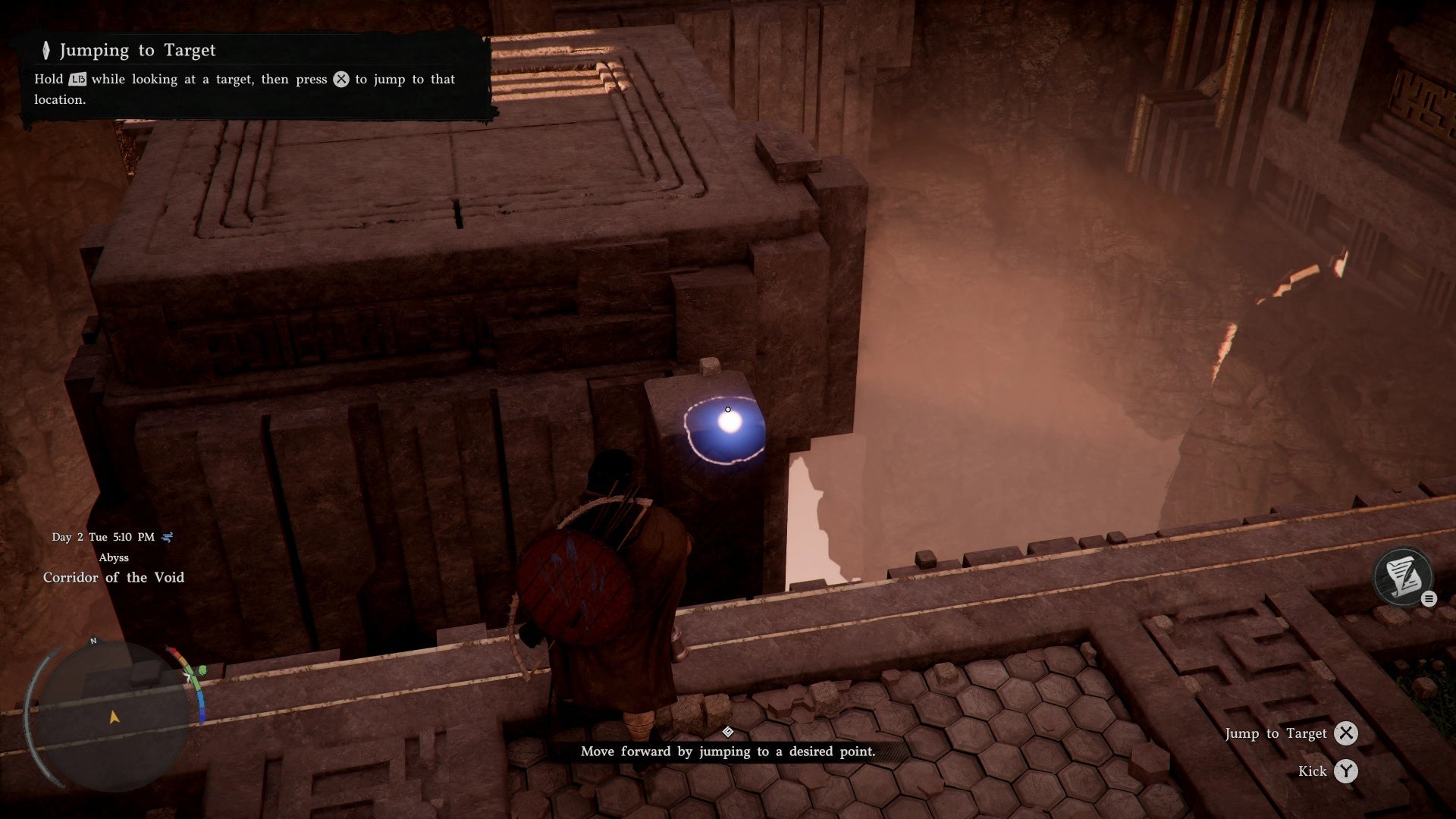 Move forward and cross the first gap. For the second jump, you'll learn the precision jump mechanic β this lets you target exactly where you want to land. Useful for narrow platforms, though not strictly required here.