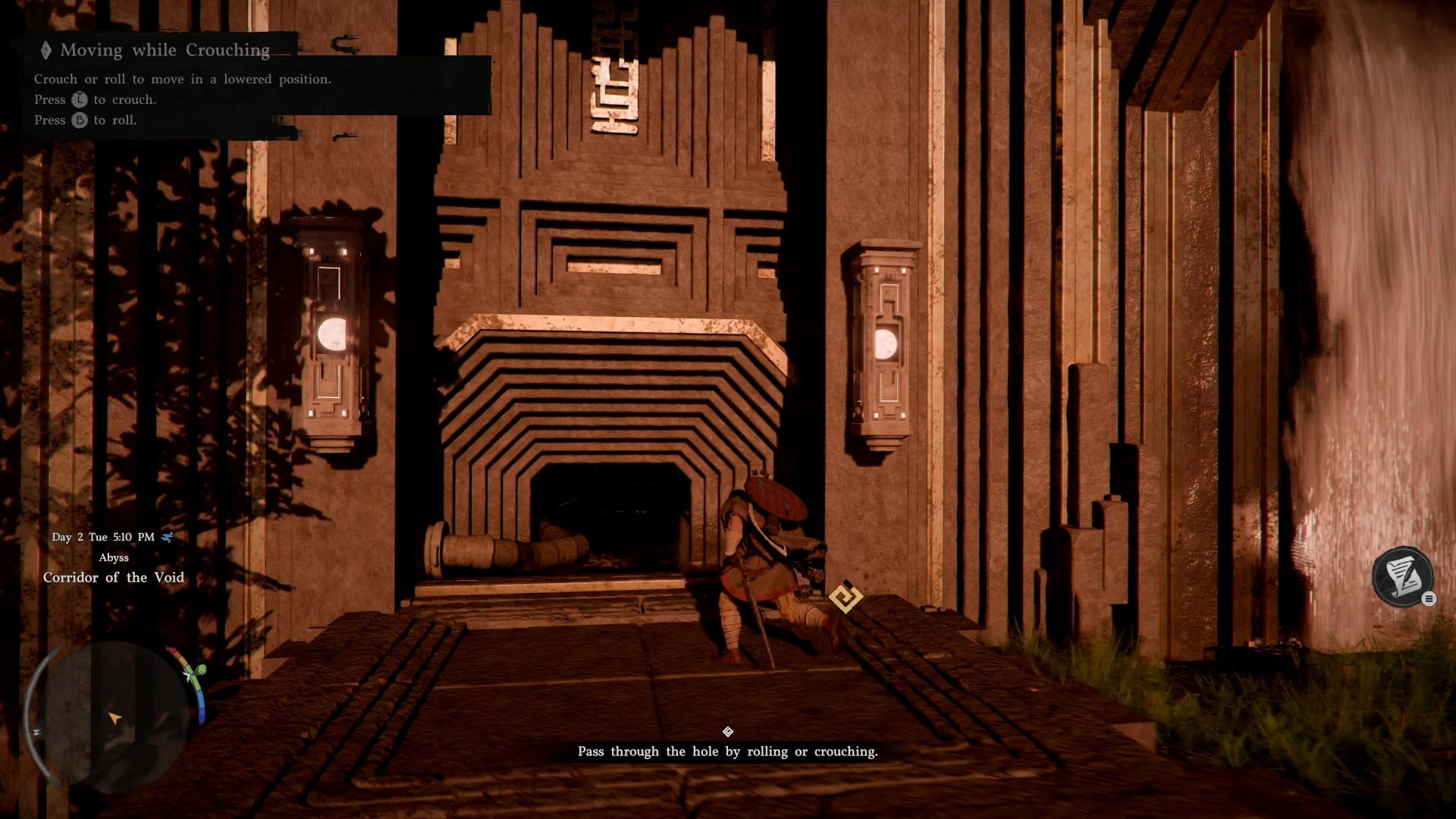 Crouch or roll through the hole to continue. The game will automatically crouch if you approach narrow spaces.