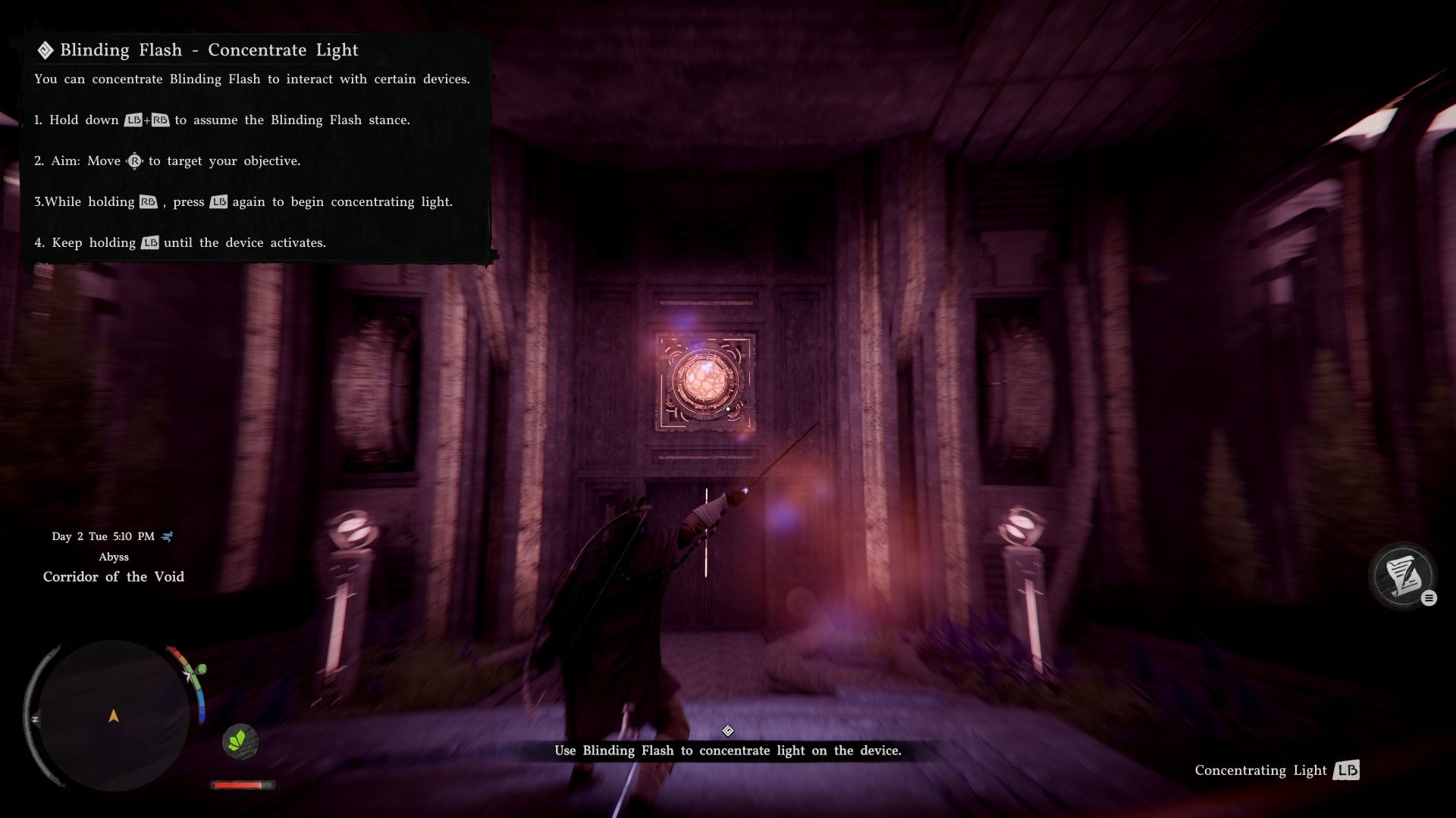 For this puzzle, you need Concentrating Light β hold the ability to focus light onto switches. Think of it like using a magnifying glass to concentrate sunlight. Aim at the switch above the door to open the path forward.