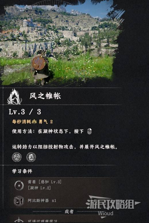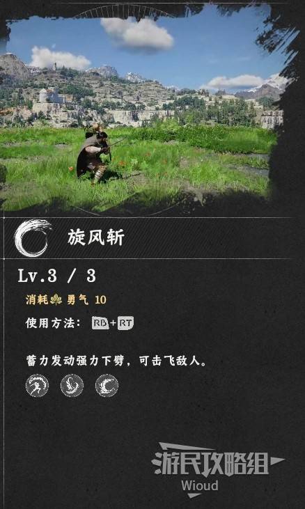 這裡會介紹「迴轉斬」— 一招強力範圍攻擊,會消耗「勇氣值」(血量旁的綠色條)。透過命中敵人或使用消耗品即可恢復勇氣值。它是艱難戰鬥中最寶貴的資源。