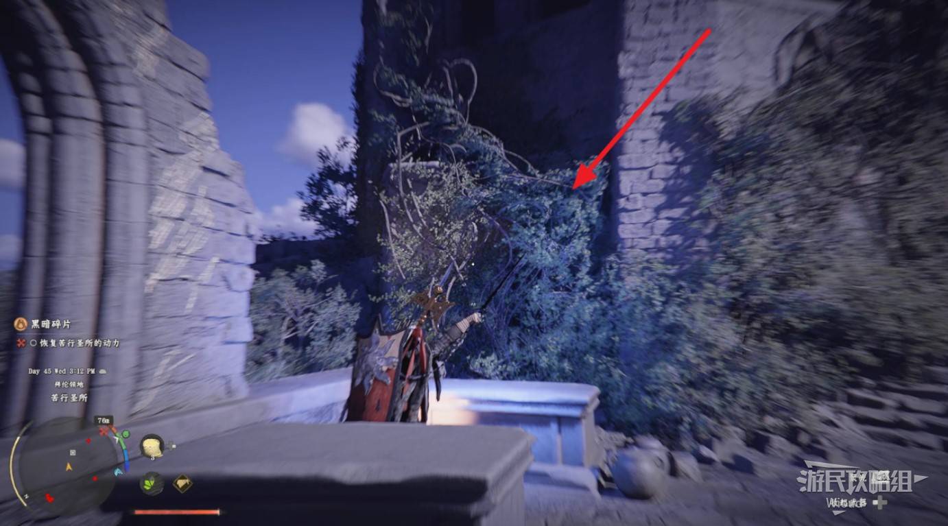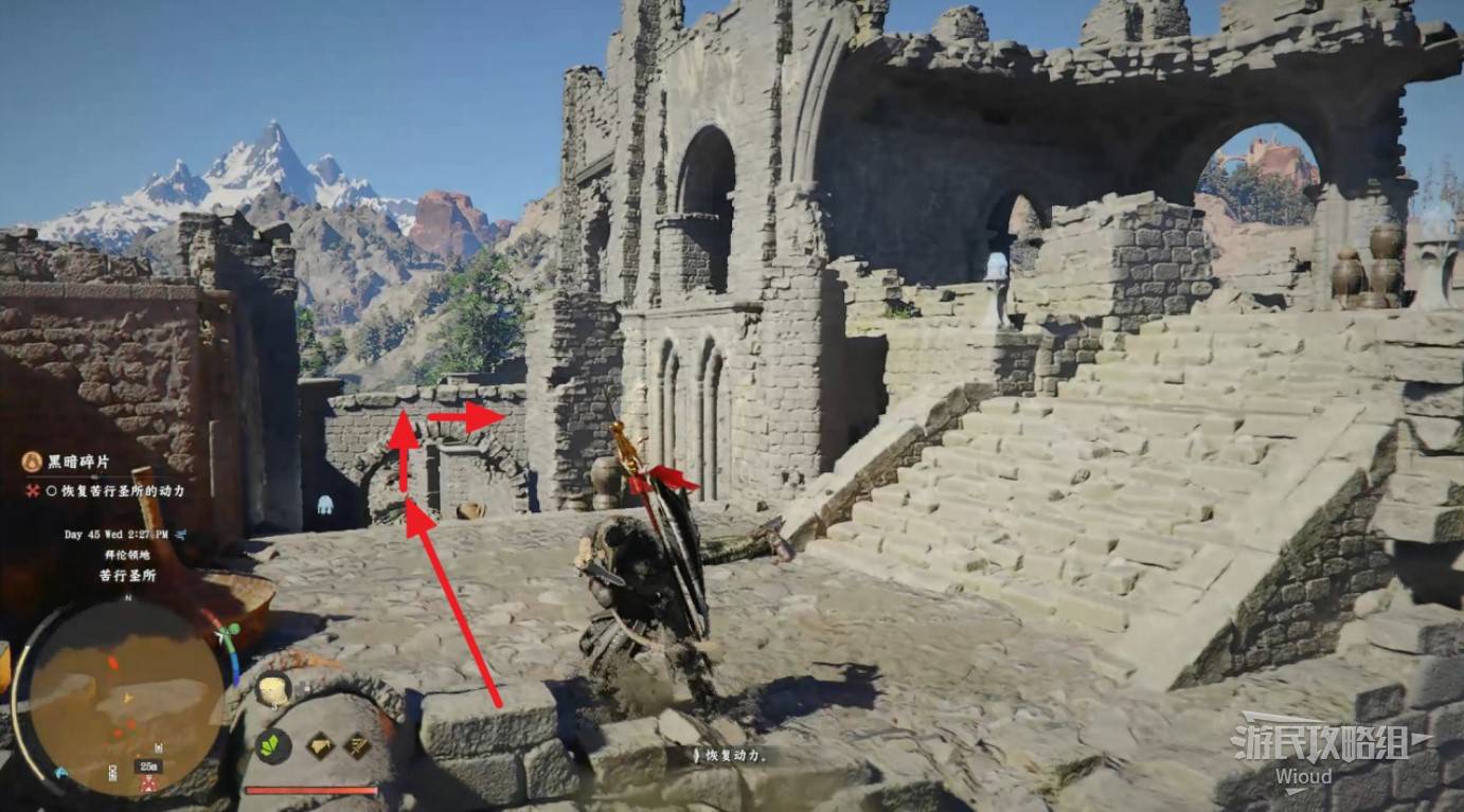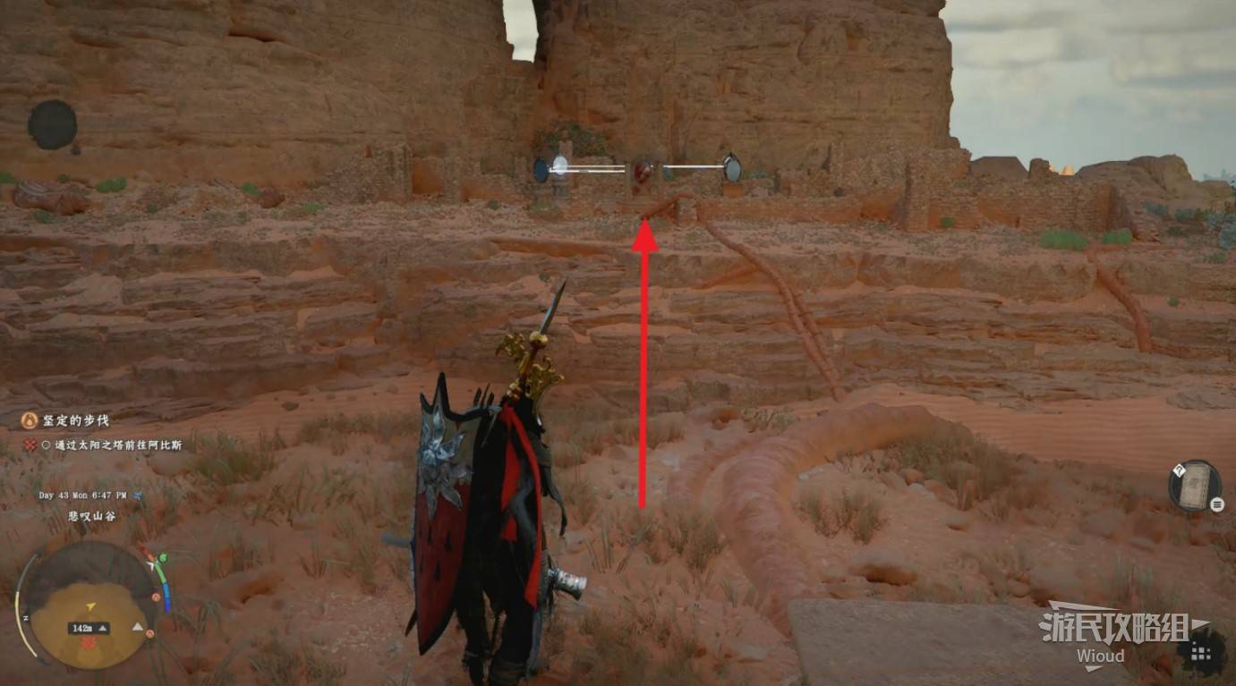 到達另一側後,翻越牆壁。只要你有體力,《紅色沙漠》幾乎可以攀爬任何表面。