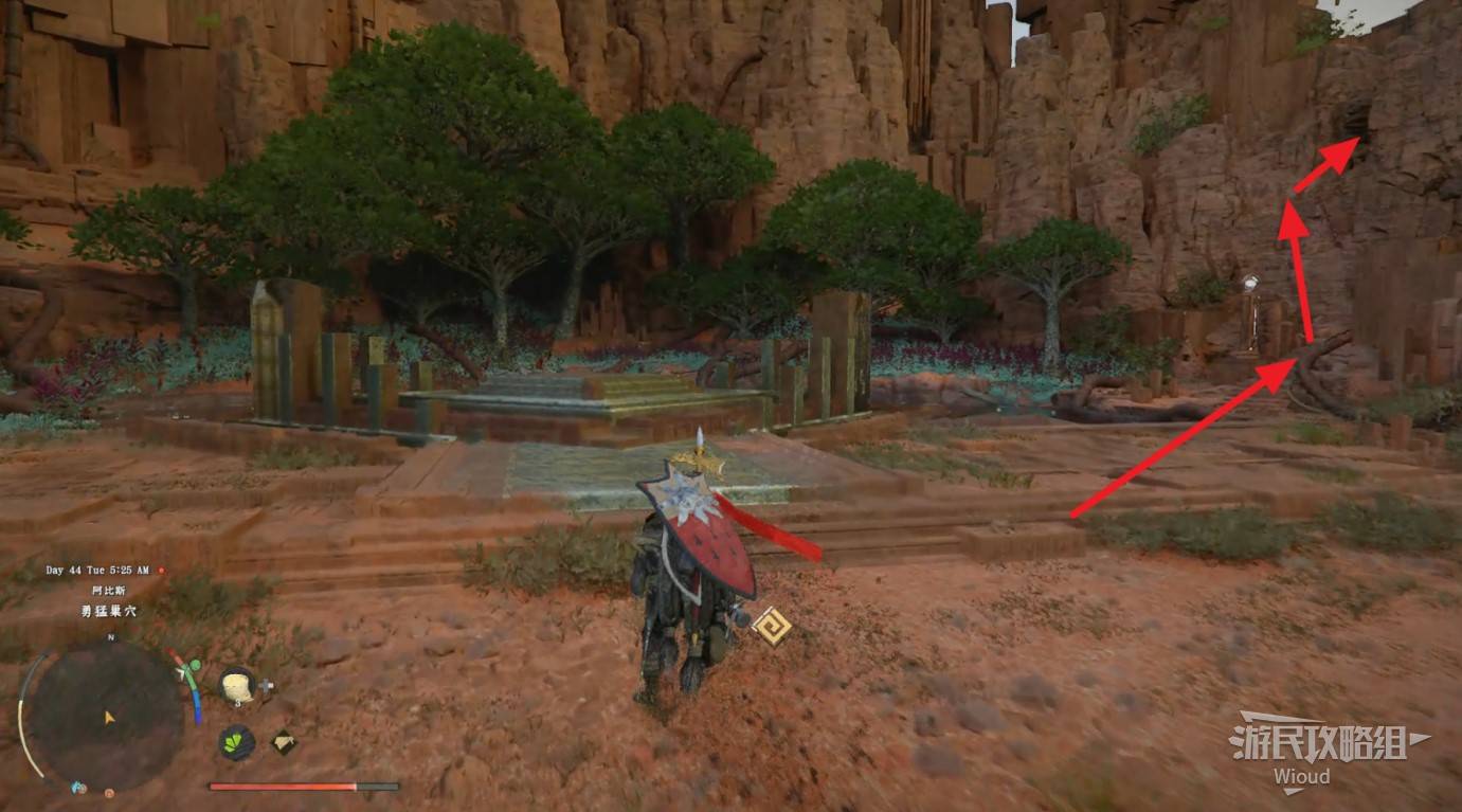 沿著路徑前進,直到抵達一堵更高的牆 — 仍可攀爬。穩定地攀爬而不是跳躍來節省體力。到達頂端後,你會在瀑布後方找到一個小洞。