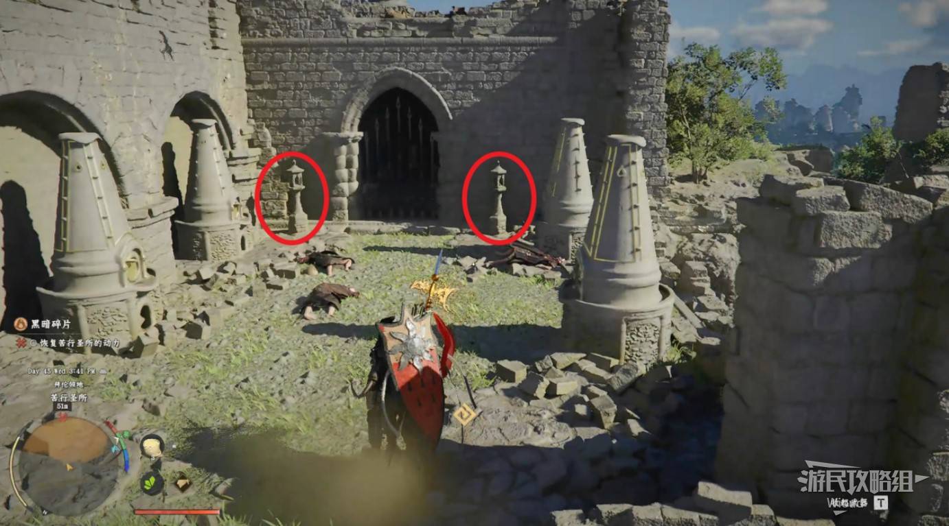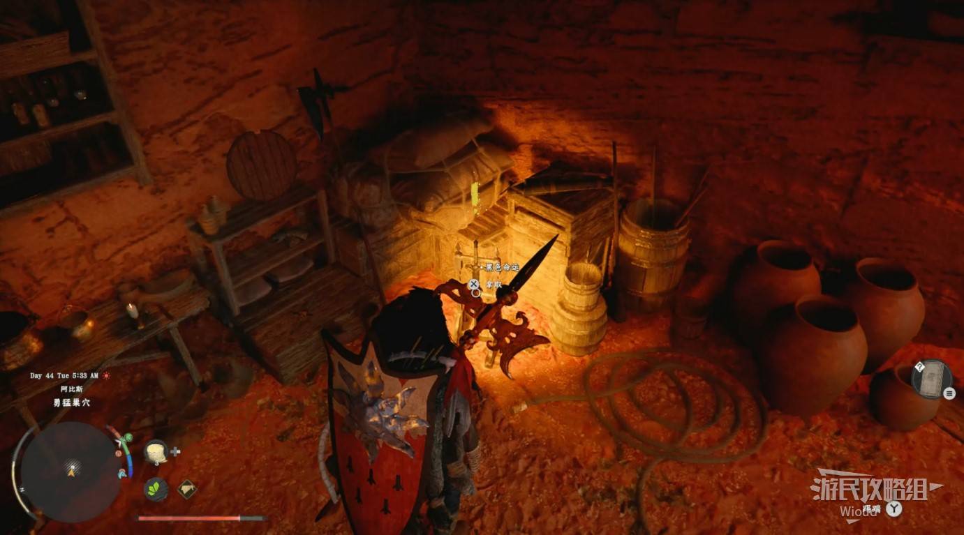 - • 肉(恢復道具) — 位於路徑右側點燃火盆旁的一根樹樁上