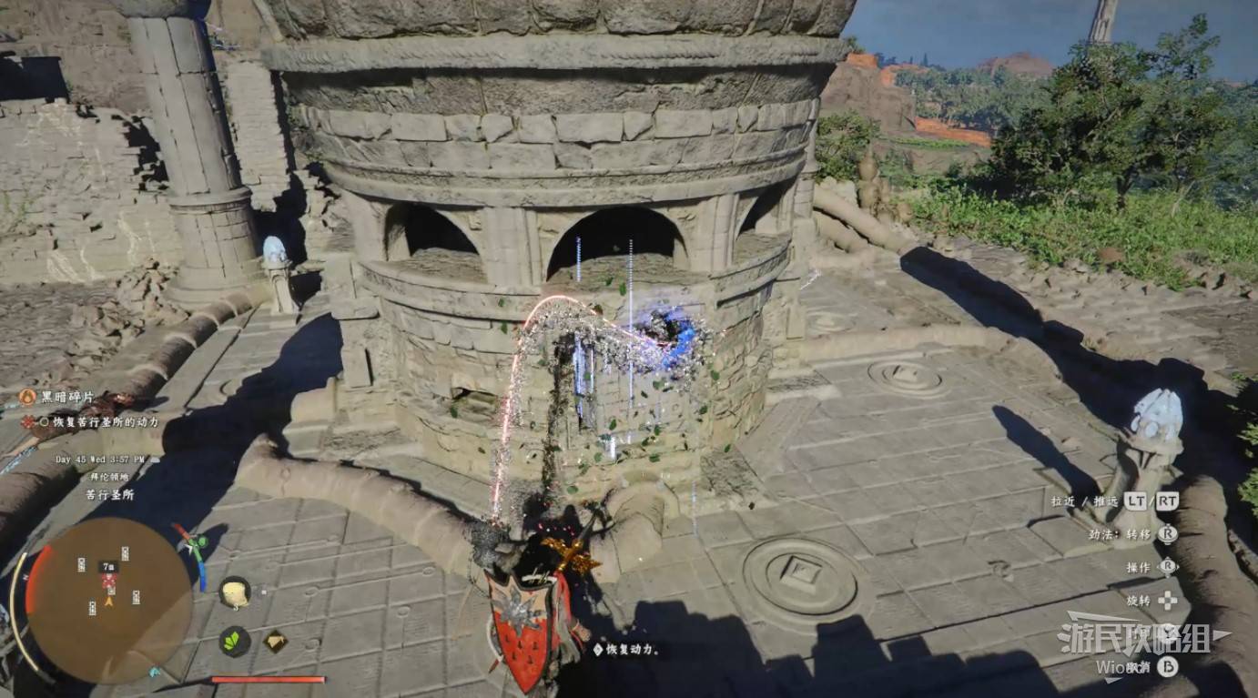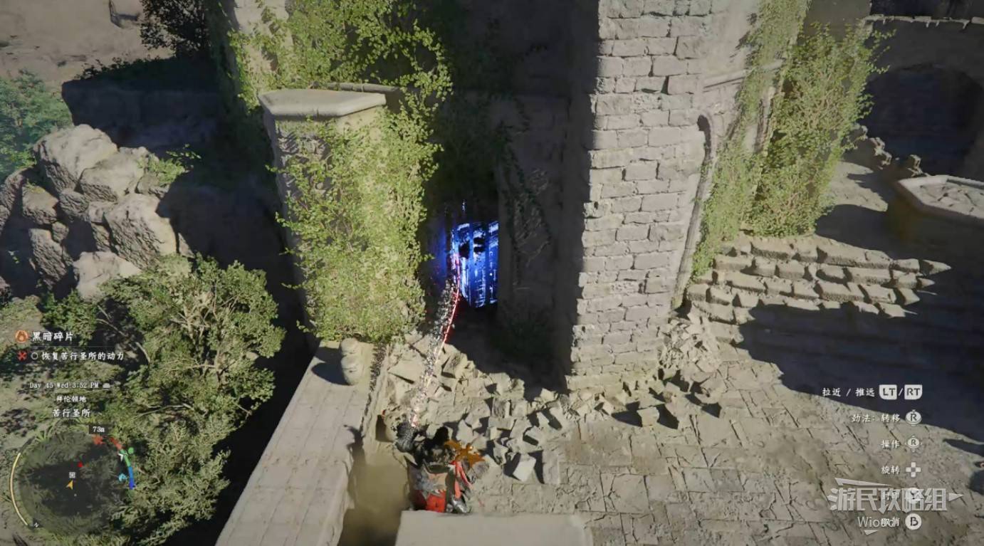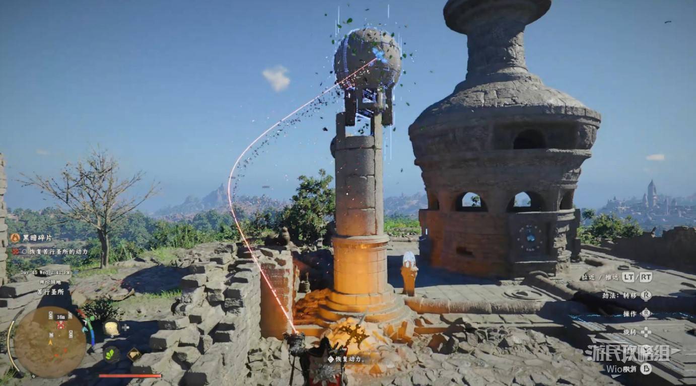 對於這個謎題,你需要使用聚光術 — 按住該能力將光線聚焦到開關上。就像用粗糙放大鏡聚焦陽光一樣。瞄準門上方的開關以開啟前方道路。