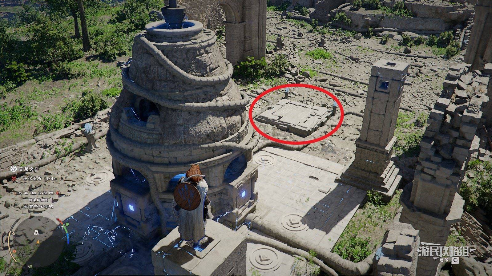 净化圣所后,机器正面会出现一个可选谜题。找寻安装在古代机器底座附近地面上的蓝色水晶。