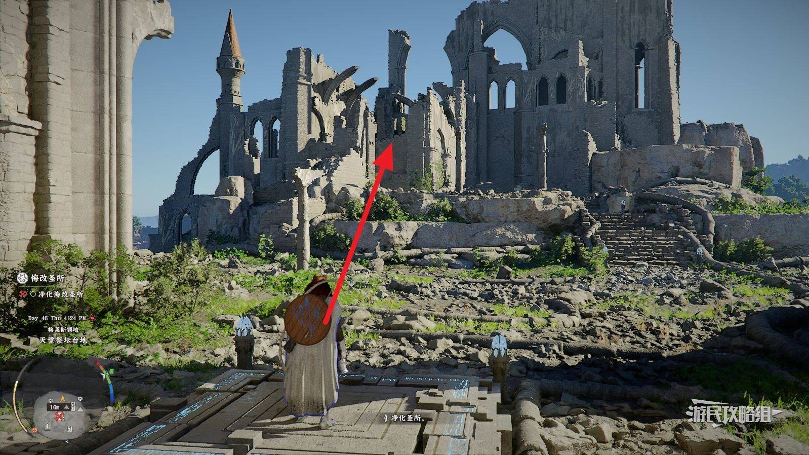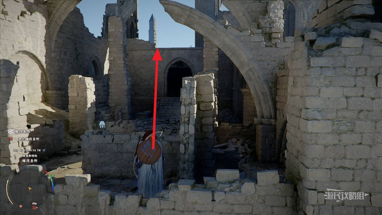 前往废墟背面的破损石墙,爬上去并继续向更高处攀登。