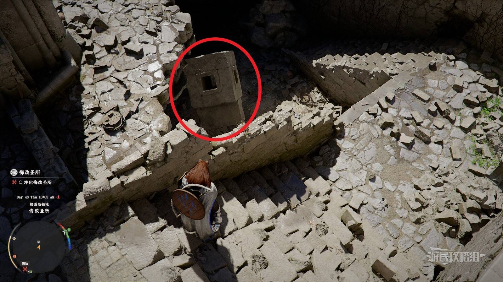 走向该区域边缘——寻找俯瞰主谜题机器的四根小柱子附近一块结构薄弱的地板砖。站在上面等待,地板将在克里夫脚下坍塌,将你摔入一个隐藏的地下密室。