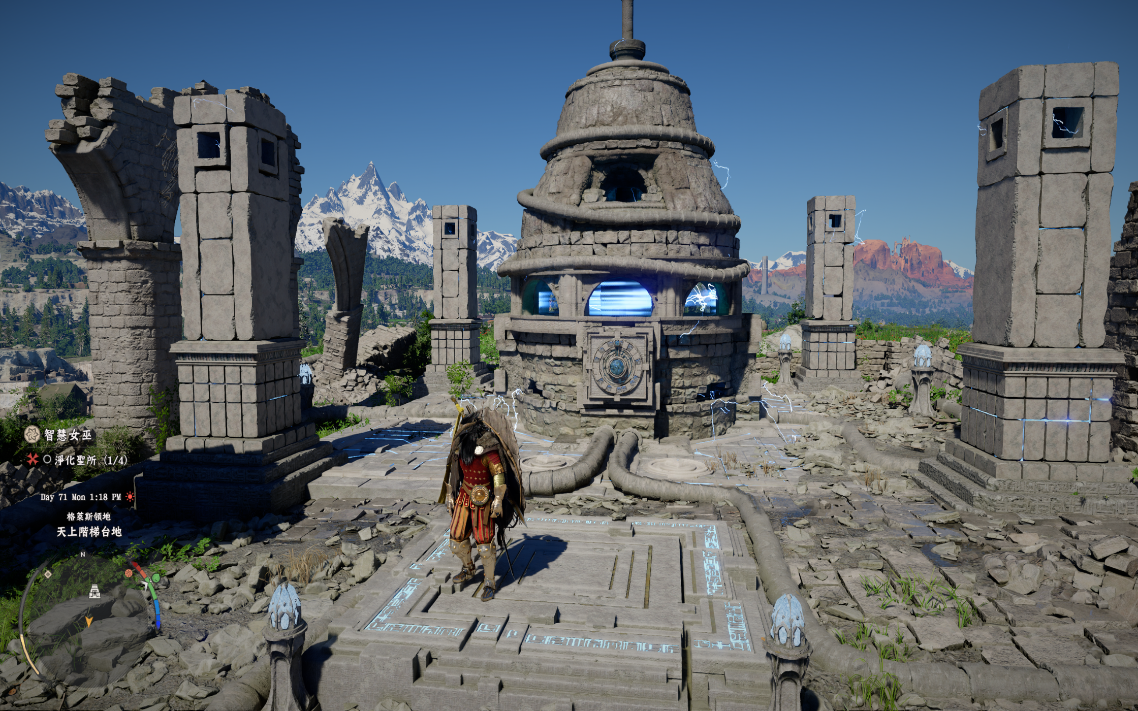 站在圆顶机器前方的石板上,面朝前方的废墟建筑。